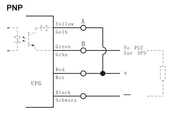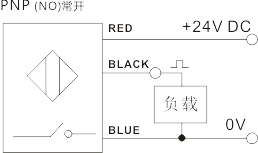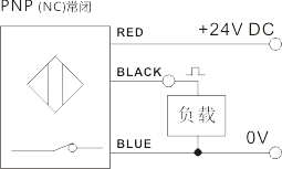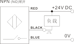 PNP常开输出配置 无纱线运动输出低电平 接线方法:红线:电源+24V; 黑线:信号输出 蓝线:0V; (注:黑线与红线直接驱动继电器线圈时,必须并联一个二极管隔离保护,输出反映纱线的运动情况:当有纱线运行时,继电器启动;当无纱线运动时, 继电器不启动。) |
